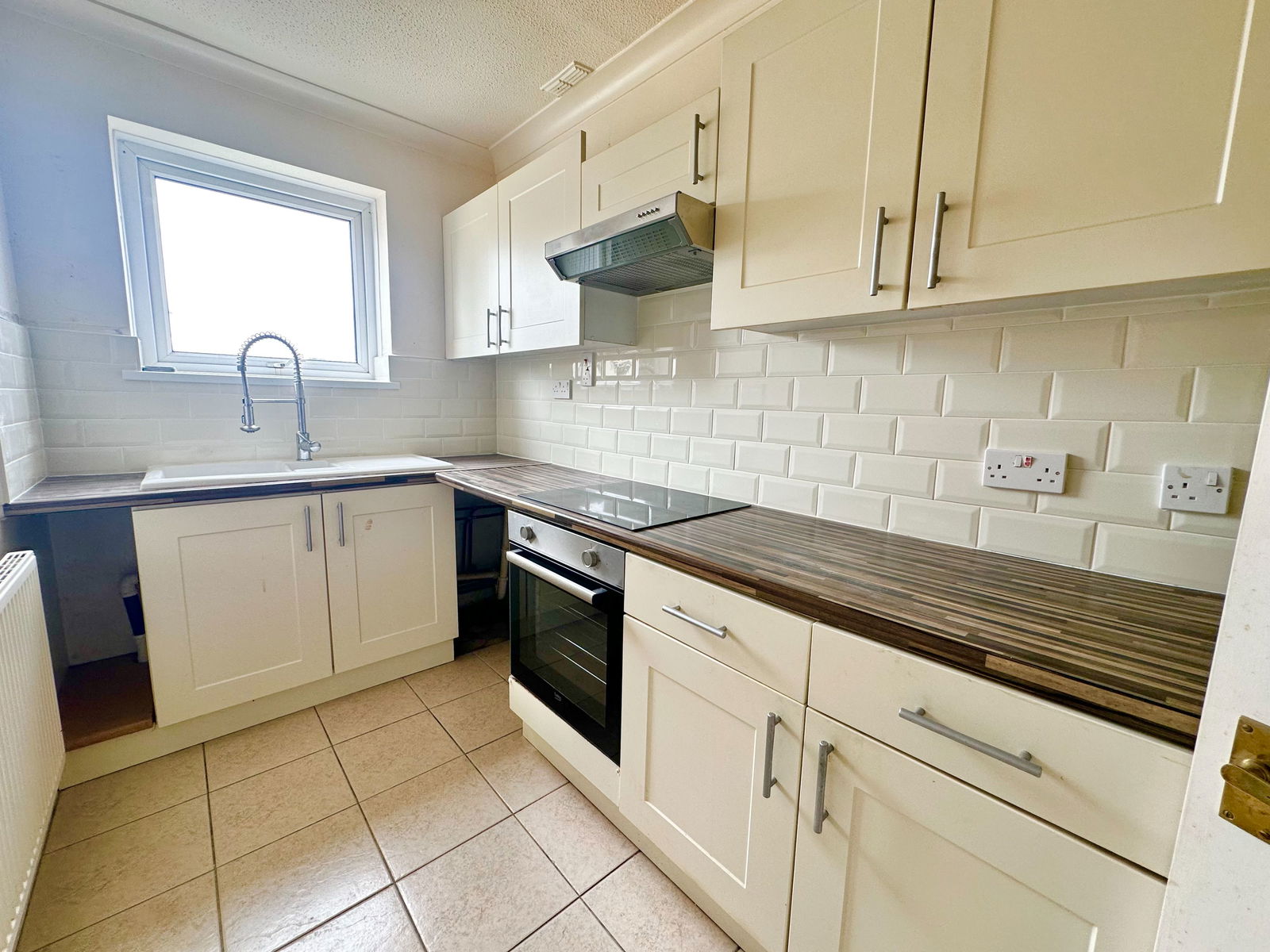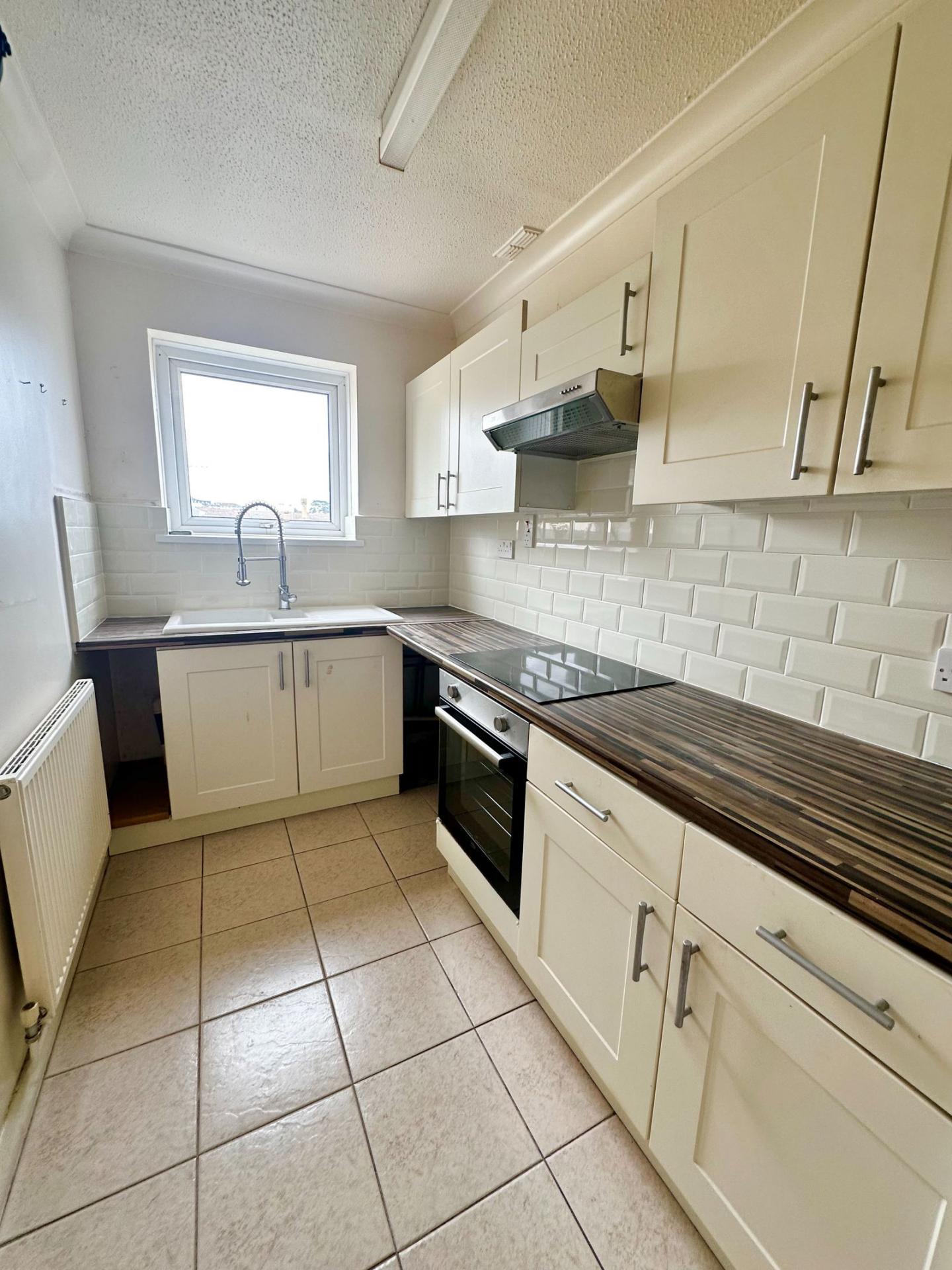 Fitted with a range of matching wall and base units with worksurface over. Inset ceramic sink unit with chrome mixer/spray tap over. Integrated electric hob with matching oven/grill below and cooker hood over. Double glazed window. Radiator. Space for fridge/freezer and plumbing for washing machine.