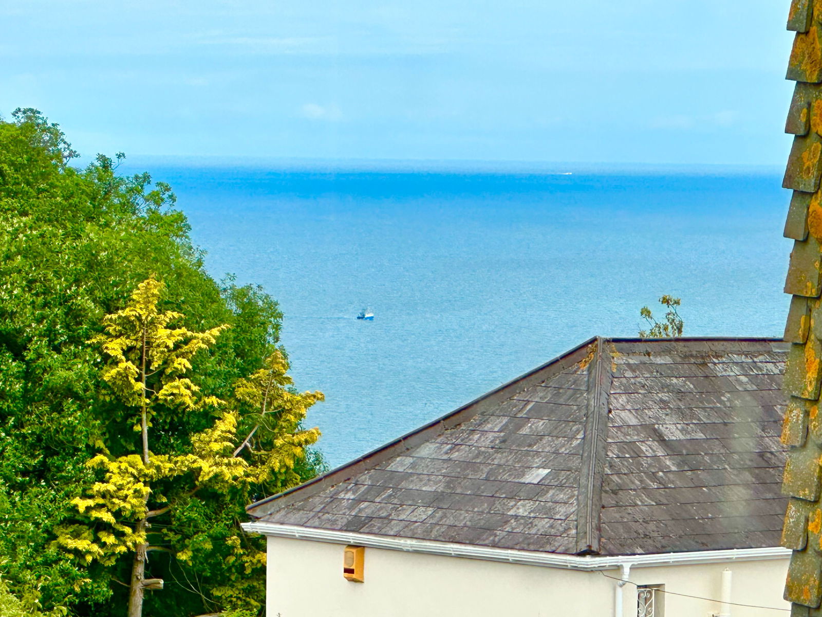 A double bedroom with double aspect double glazed windows both of which enjoy an outlook and one has sea views. Radiator. Cupboard housing Ideal gas boiler with storage over.