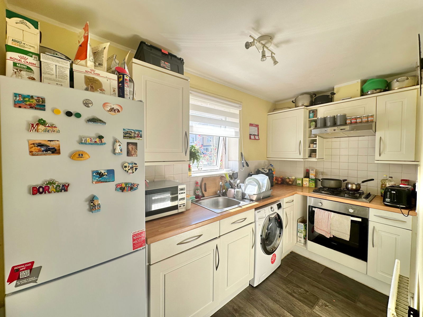 KITCHEN - 3.53m x 1.64m (11'6" x 5'4") Double glazed window to the side, modern kitchen with wall and floor mounted units, gas hob and electric oven with built in washing machine and space for an upright fridge freezer.