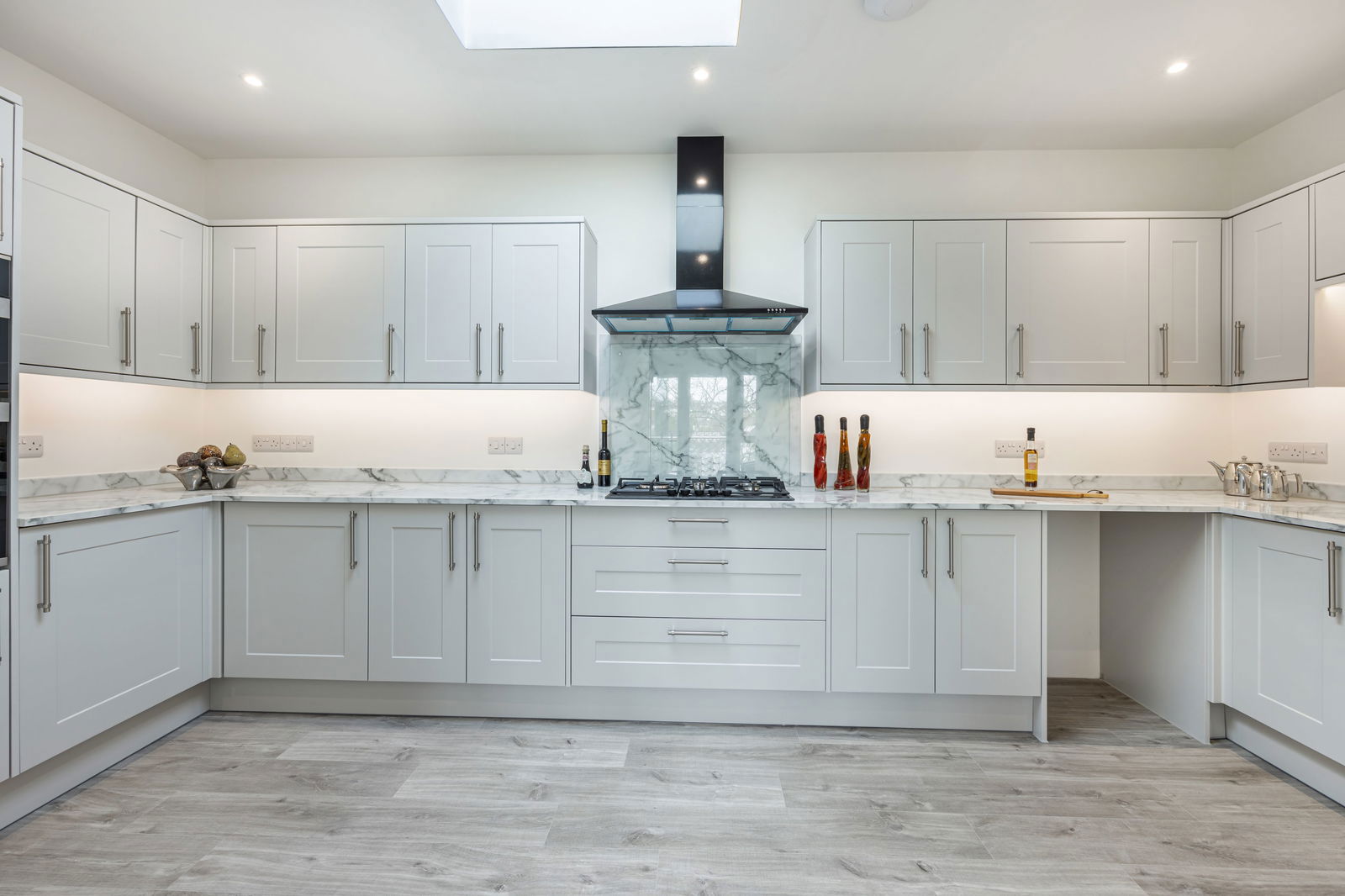 A beautifully appointed and spacious kitchen fitted with a comprehensive range of contemporary wall and base units. There is a range of integrated appliances including a built in oven and hob with stainless steel cooker hood and glass splash back, dishwasher and fridge/freezer. Spotlights to ceiling. Plumbing for washing machine.