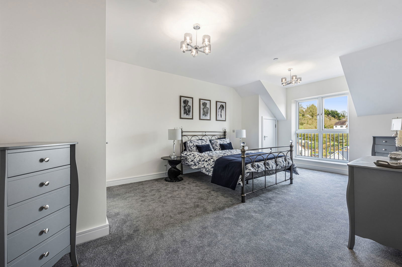 An expansive master bedroom with space for a king sized bedroom and associated furniture. Door to: