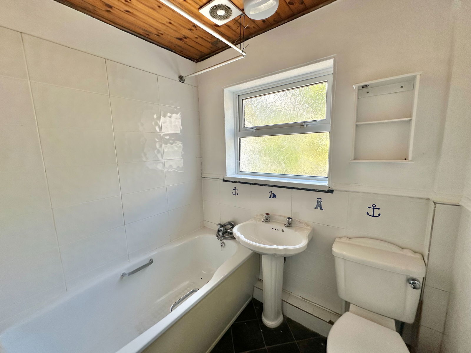 BATHROOM Fitted with a matching three piece white suite comprising a pedestal hand wash basin, push button WC and a panel fronted bath with mains shower above. Partly tiled walls and a tiled effect vinyl hard flooring. Access hatch to loft space and extractor. Radiator. Frosted double glazed window to the rear aspect.
