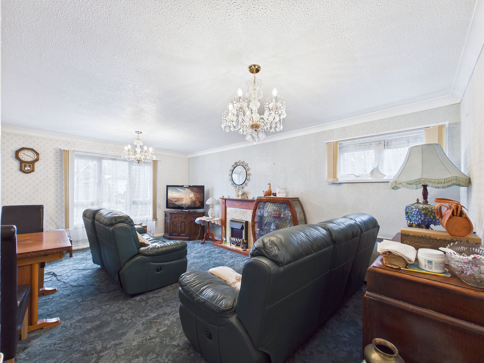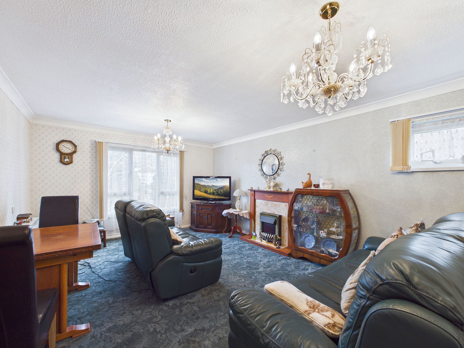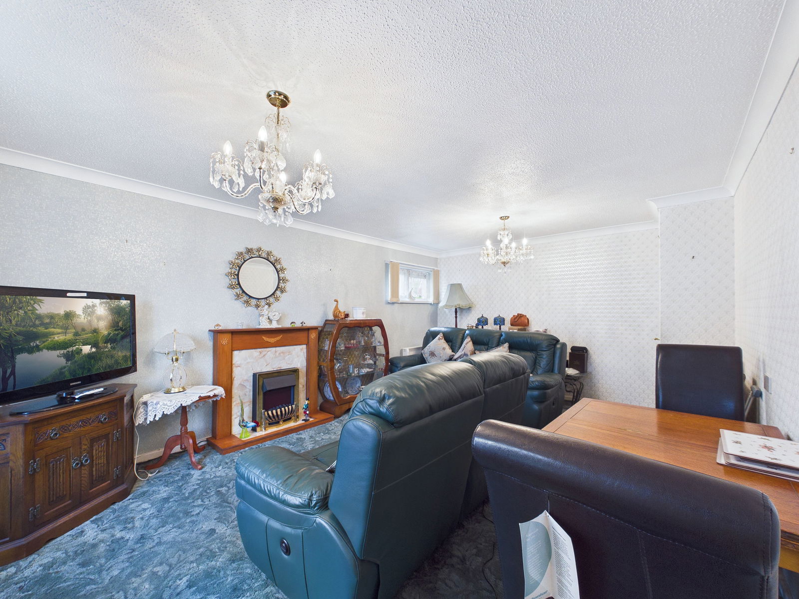 LOUNGE DINER 5.5 m x 3.7 m A spacious room with double aspect double glazed windows, one of which enjoys an open outlook across the communal grounds. Decorative fireplace. TV point. Two night storage heaters.
