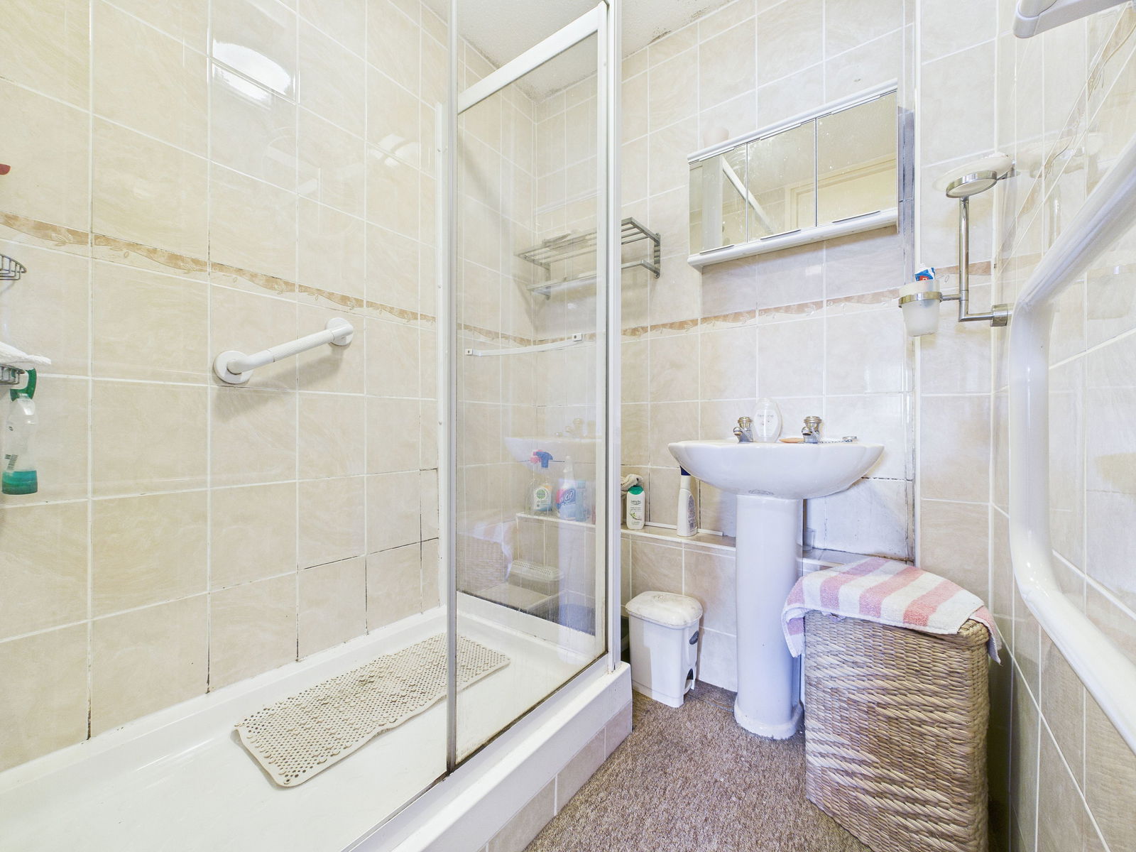 SHOWER ROOM Wide shower cubicle with electric shower fitment and glass surround. Pedestal wash hand basin. Tiled walls. Heated towel rail. Separate WC Close couple WC and fully tiled walls.