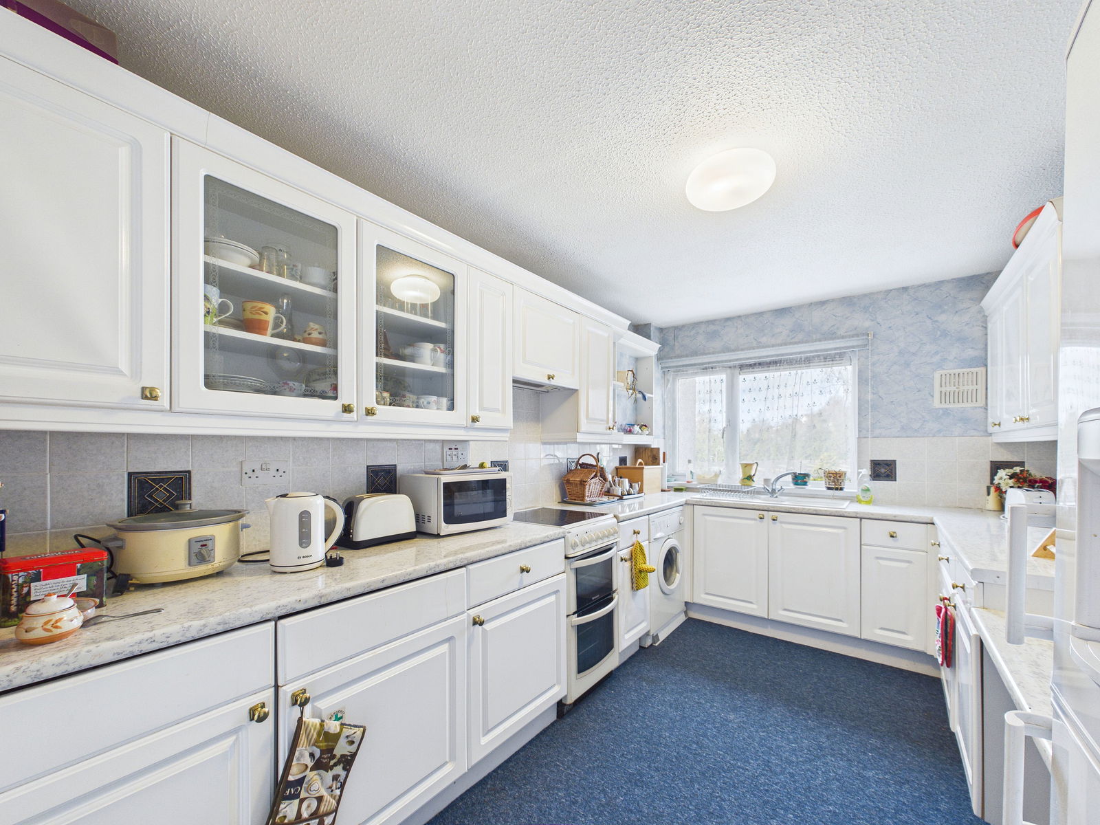 KITCHEN 3.9 m x 2.5 m max Fitted with a range of white wall and base units with worksurface over and inset composite sink unit. Appliance spaces for cooker and washing machine and space for a fridge freezer. Small breakfast bar. Double glazed window enjoying an outlook similar to the lounge. Cooker hood. Integrated fridge and freezer.