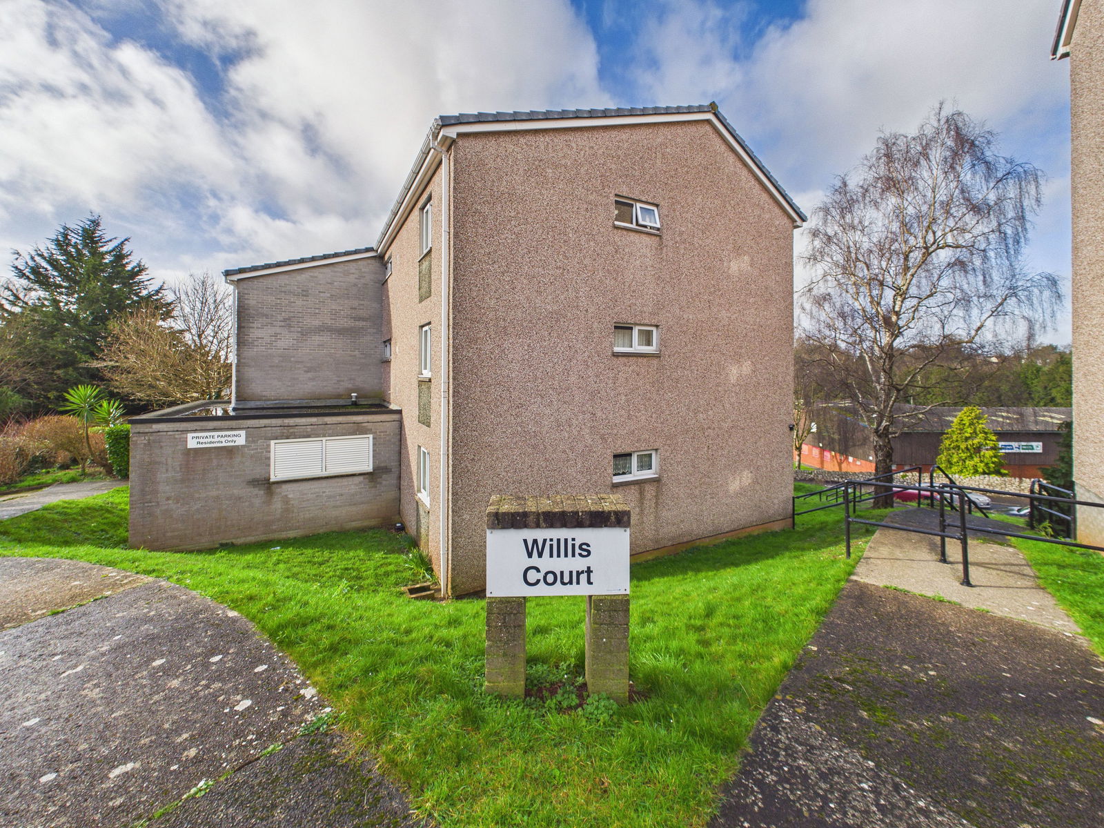 OUTSIDE The development stands in communal grounds which are laid mainly to lawn with insect mature trees.