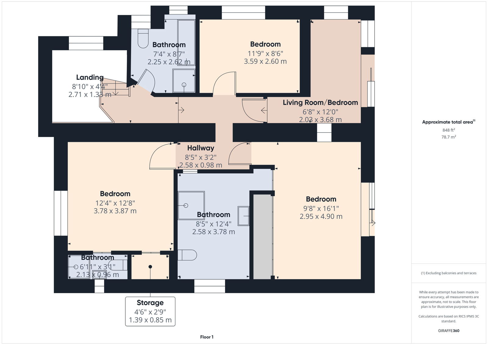 A stunning modern suite comp a large vanity unit topped with black granite with inset wash hand basin, shower cubicle with mains fed shower unit, low level wc and bidet. Beautifully tiled walls and floor with original “A” frame beamed ceilings. Large mirror over vanity unit. Glazed door with window over to decorative balcony. Two ladder radiator.