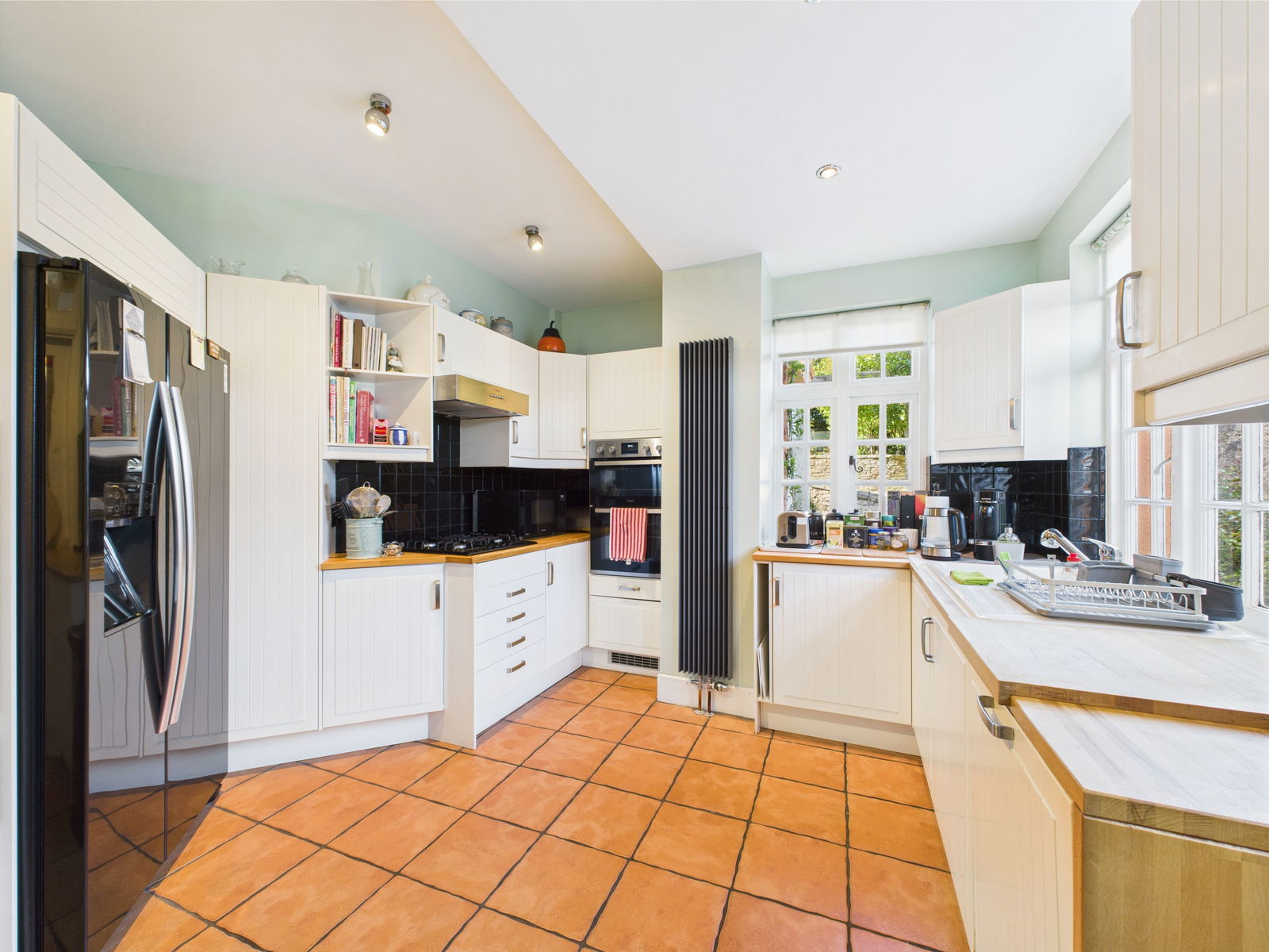 A cottage style kitchen fitted with a good range of white panel effect wall and base units with wood block work surface inset ceramic sink unit with spray/mixer tap. Neff dishwasher integrated, Zanum double oven and grill plus gas hob with cooker head over. Recess for American style fridge freezer. Tiled flooring. Contemporary Radiator. Double glazed window. Door to outside. Pantry cupboard. Feature stained glass window.