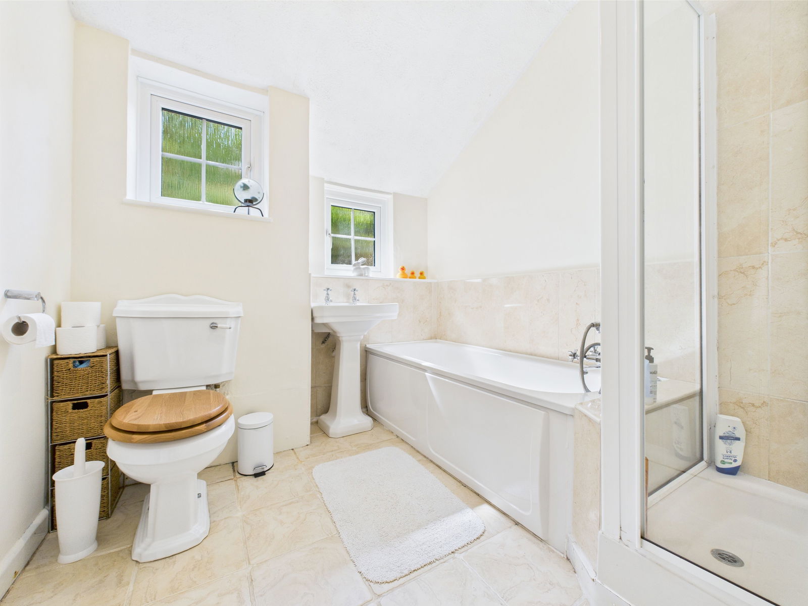 Fitted with a white suite having a panelled bath with shower attachment, shower cubicle with shower fillet and low level wc. Two double glazed window. Radiator. Tiled floor.