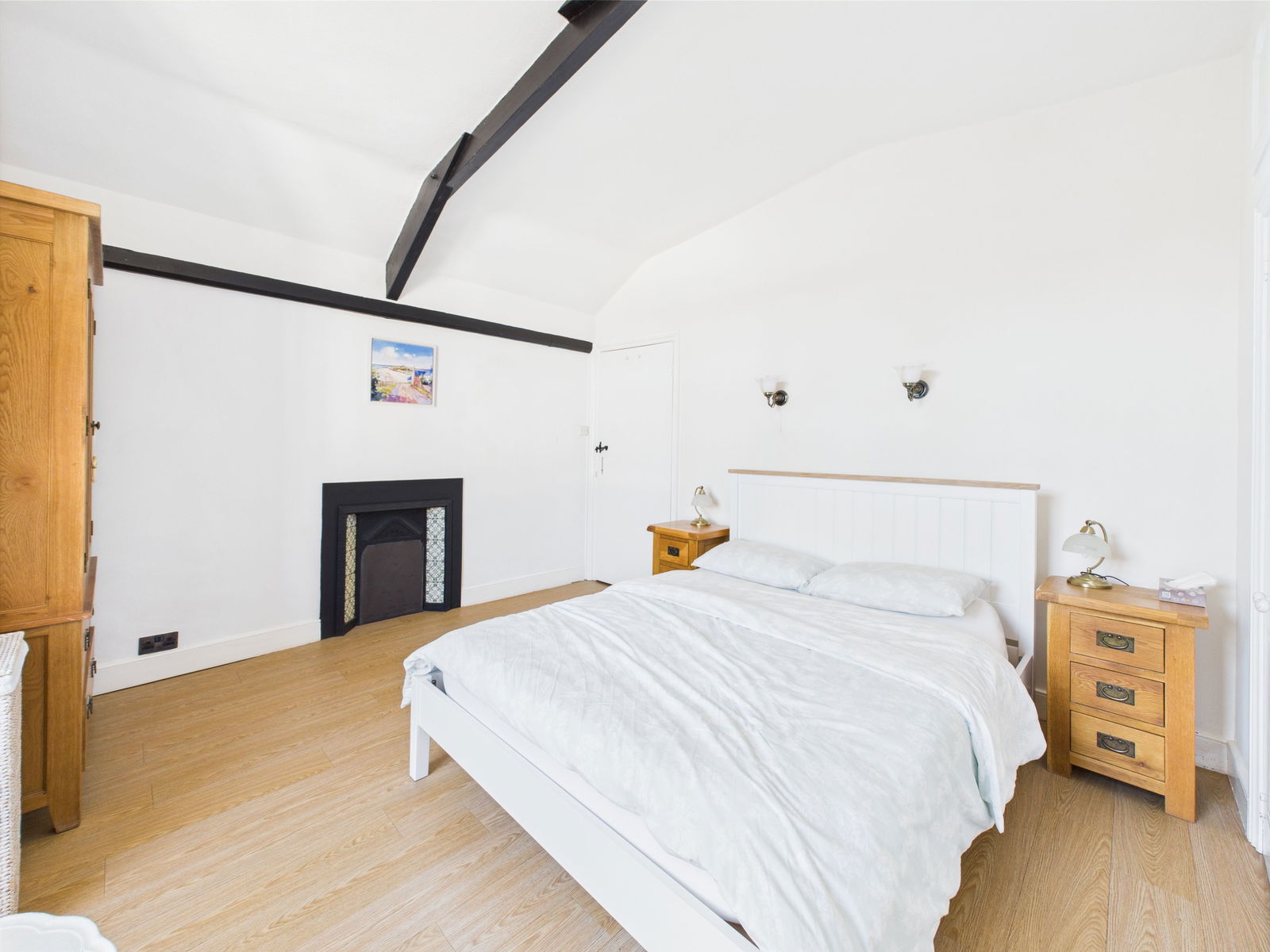 Another large double bedroom with original decorative fireplace. Built in wardrobe/airing cupboard housing ideal gas boiler. Feature arch window. Radiator. Beamed ceilings. Wall light points.