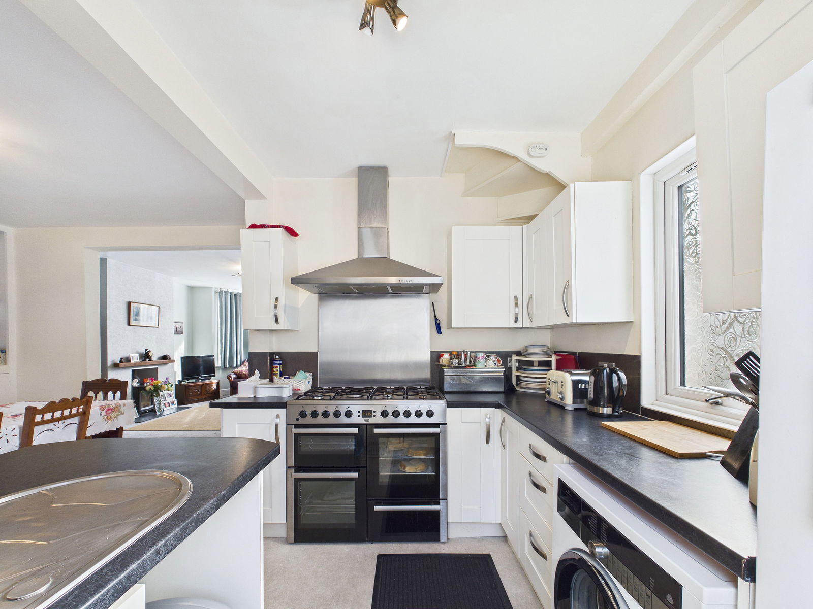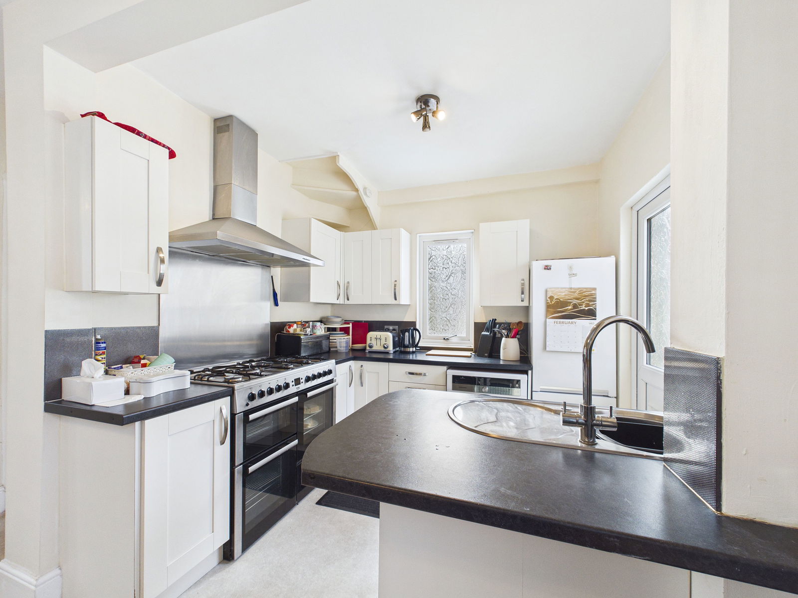 KITCHEN. 2.40 x 2.66 max Fitted with a matching range of wall and floor mounted units comprising of cupboards and drawers. Modern rolled edge work surfaces with inset 1 bowl stainless steel sink unit with mixer tap. Tiled splash backs. Gas cooker with fitted cooker hood above. Double glazed frosted window to side aspect and a small double glazed frosted window to the rear aspect. Double glazed door leading out into the rear down the steps. Space for a washing machine and fridge / freezer. There is also space and plumbing for a dishwasher. Vinyl hard flooring.
