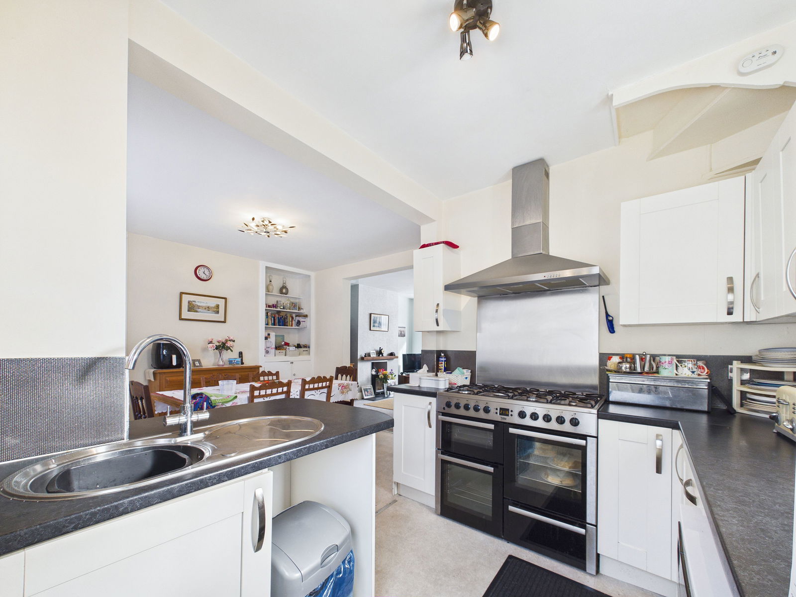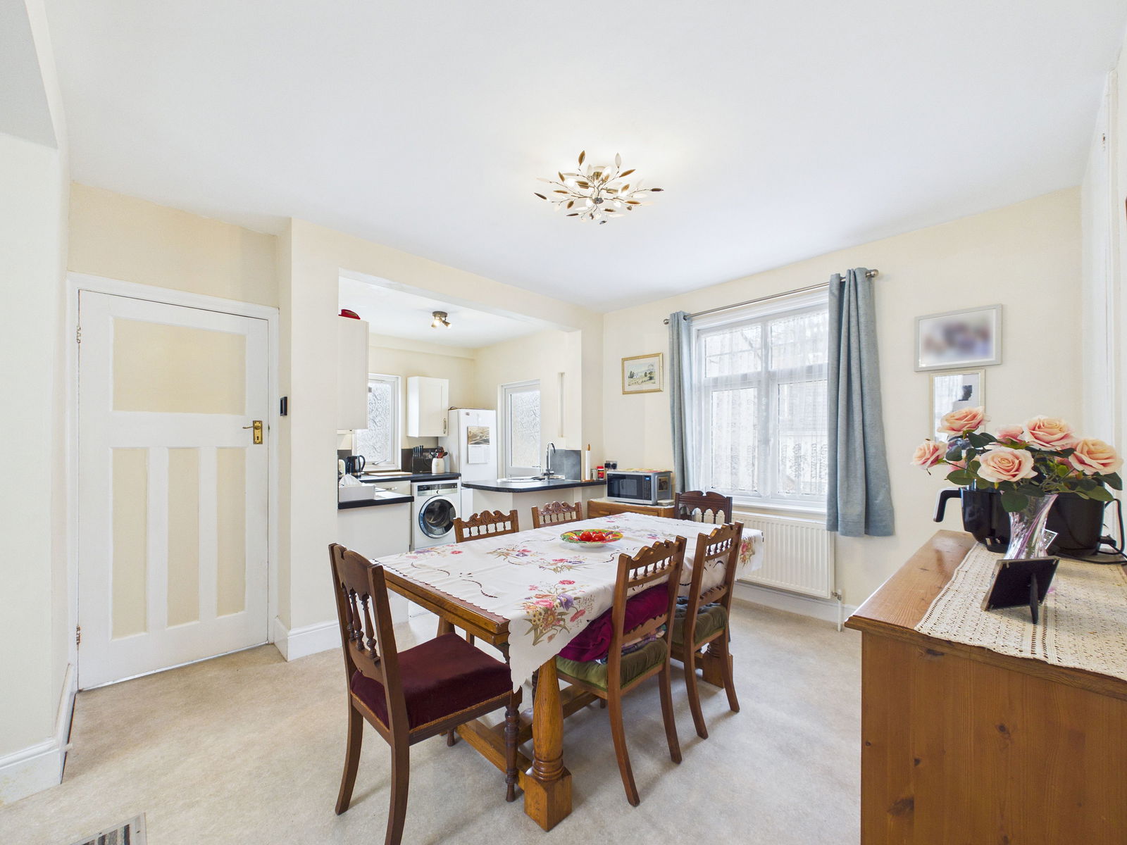DINING ROOM. 3.234 x 3.725 max A bright room with ample space for a good size dining table. Fitted shelving and cupboard storage either side of the original chimney breast. Double glazed window to the rear aspect and vinyl hard flooring. Radiator. Opening to kitchen and an opening to:-