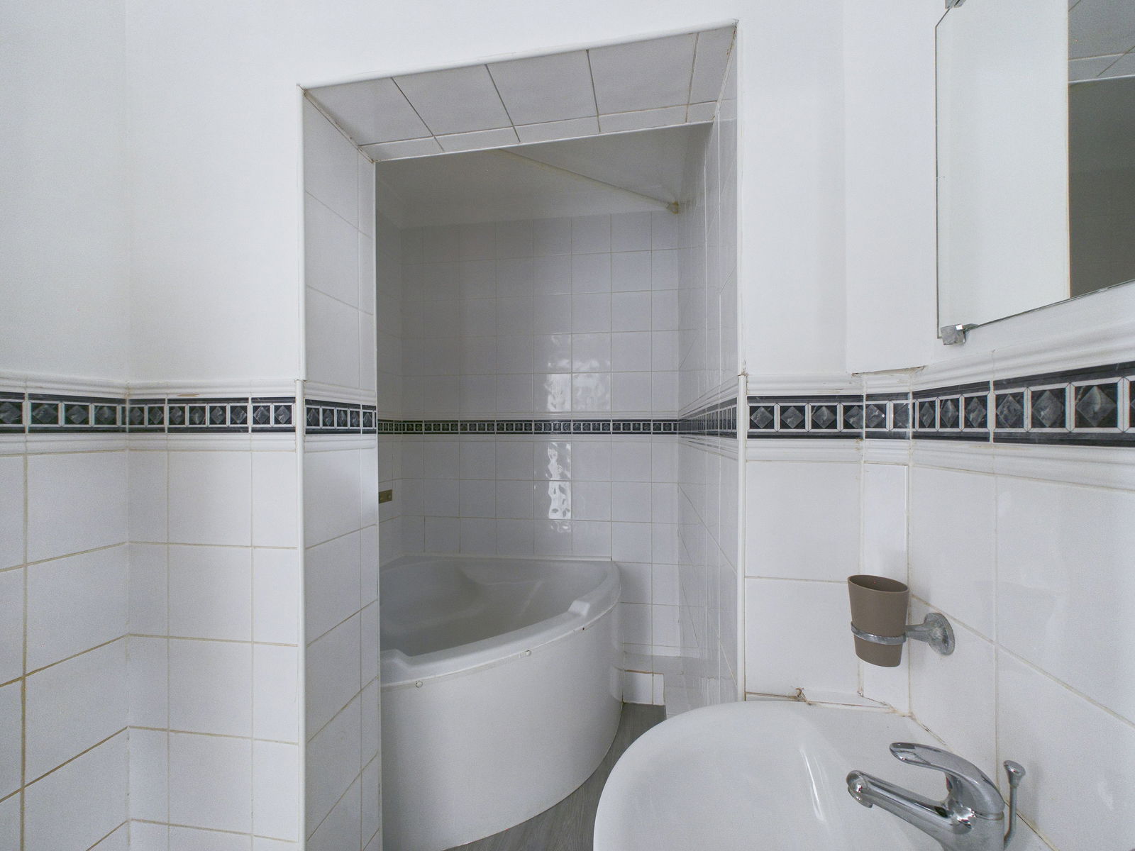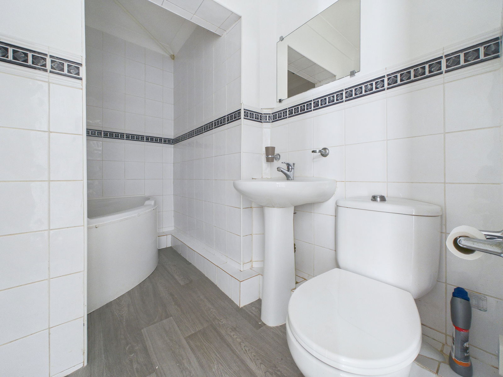 BATHROOM Corner bath with shower over low level W/C and basin, fully tiled, wall mounted radiator.