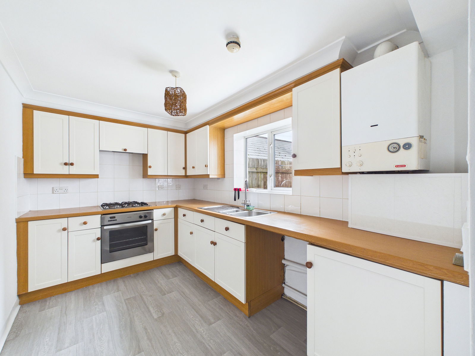 KITCHEN - 3.44m x 2.2m (11'3" x 7'2") A good sized kitchen with built in oven and hob, space for a washing machine. Cupboards and drawers over surfaces, grey vinyl flooring, combi boiler, window out to patio/courtyard area