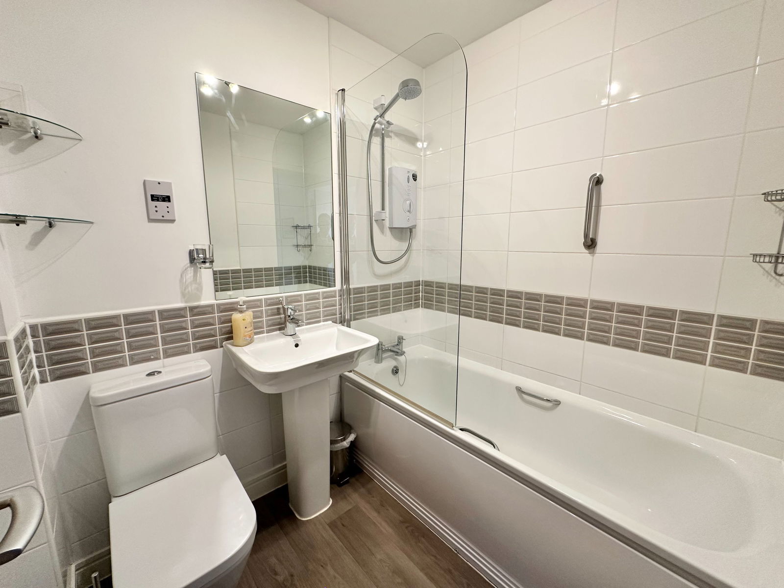 FAMILY BATHROOM A quality Roca white suite comp bath with Mira electric shower fitment over and glass splash screen. Pedestal wash hand basin with mixer tap and mirror over. Close couple w/c with dual flush part tiled walls. heated towel rail. Shaver point. Stairs to