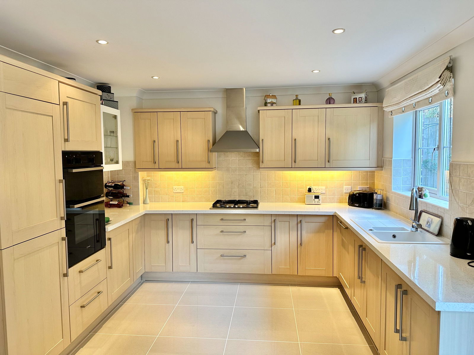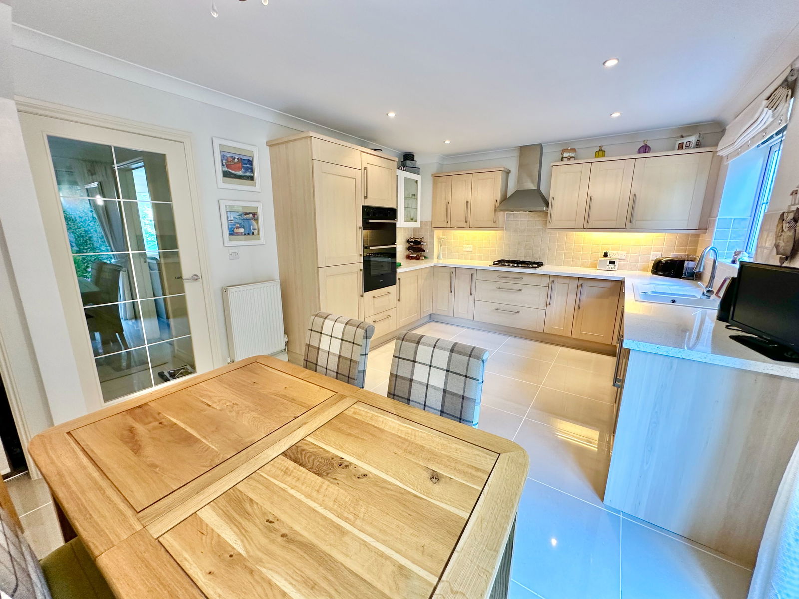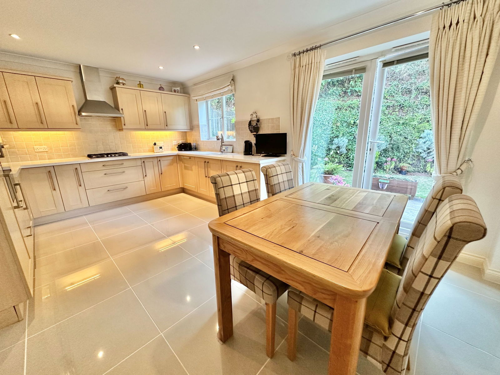 KITCHEN/DINBER - 5.3m x 3.4m (17'4" x 11'1") A spacious room which is well appointed, with a comprehensive range of matching wall and base units. There are various built in appliances, including stainless steel hob and hood, double oven/grill, dishwasher and fridge freezer. Under cabinet lighting. Composite sink unit with modern mixer tap. TV point. Radiator. Double glazed window and French doors to rear garden. Under stairs recess for storage. Luxury porcelain floor tiling. Spot lights to ceiling.