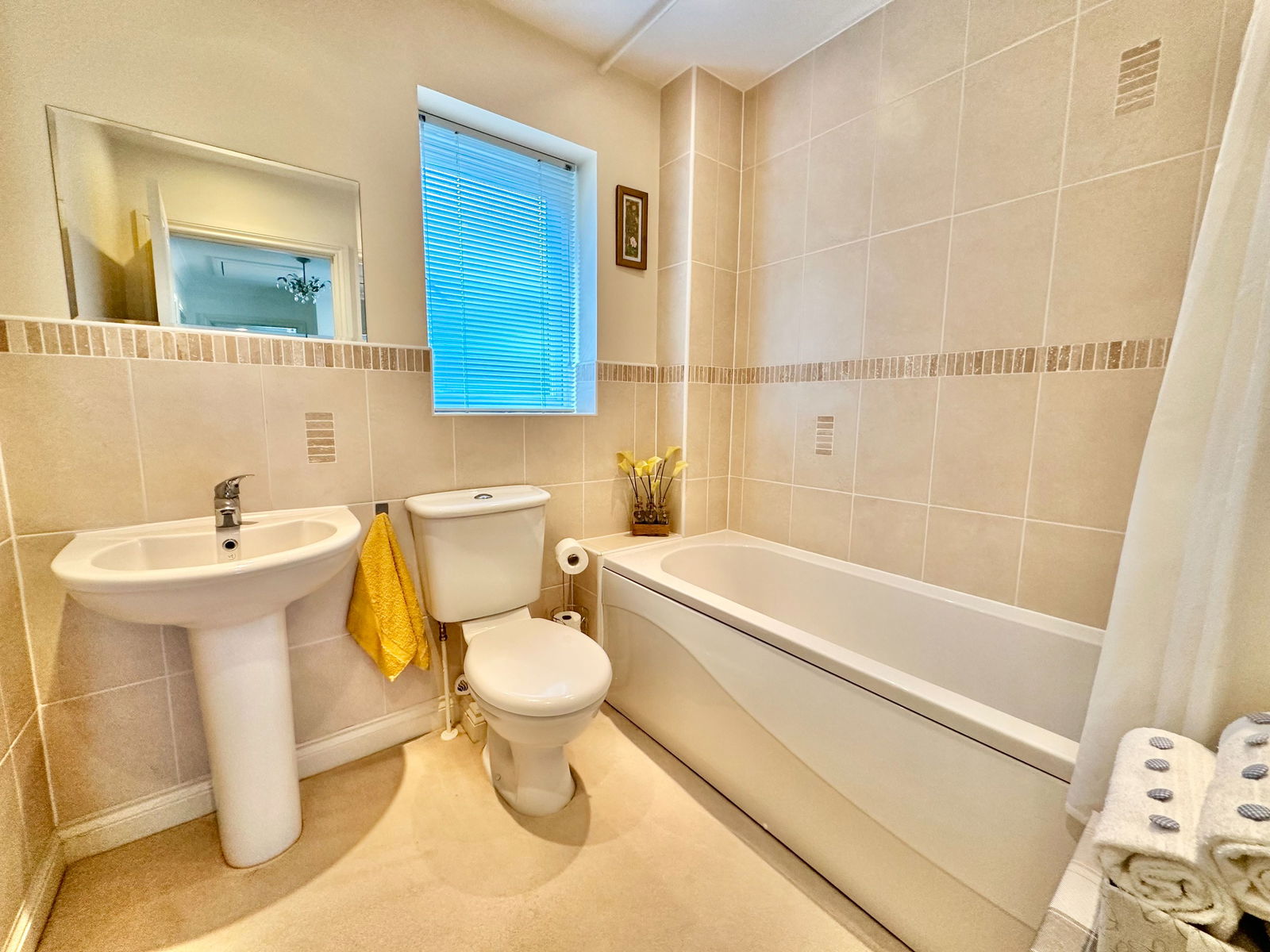 BATHROOM Fitted with a white suite having a bath, shower attachment, Low level WC and hand wash basin. Part tiled walls. Double glazed window.