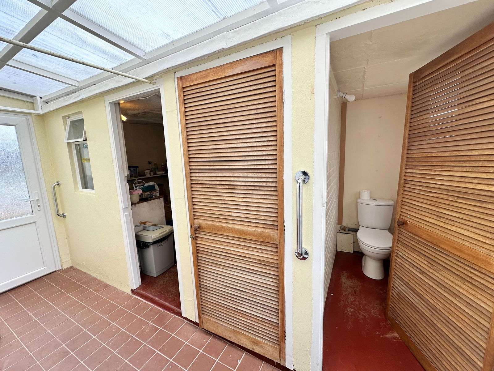 Double glazed door to front and rear garden respectively. There are three rooms, one being a utility/workshop 2.3m X 1.8m max with power and lighting, a tool store with shelving and a WC.