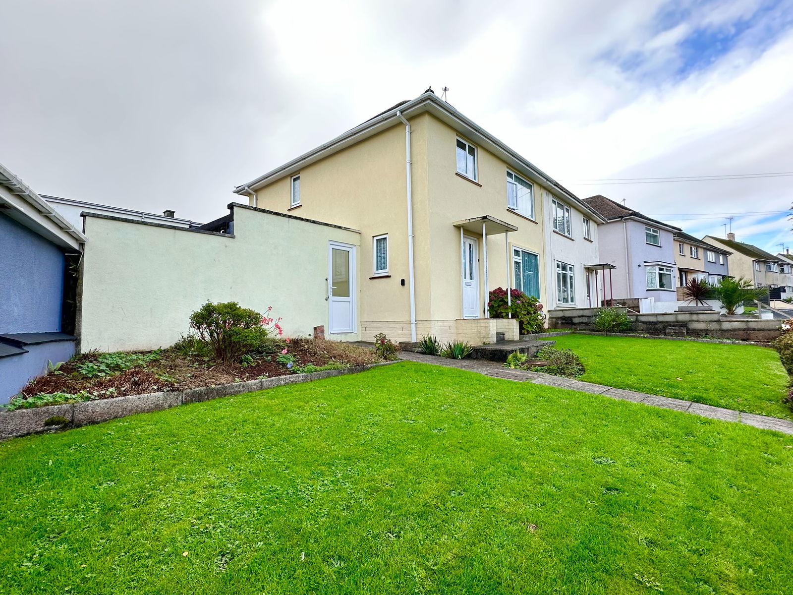 A wide garden frontage of mainly lawn, with pretty flower and shrub borders.
