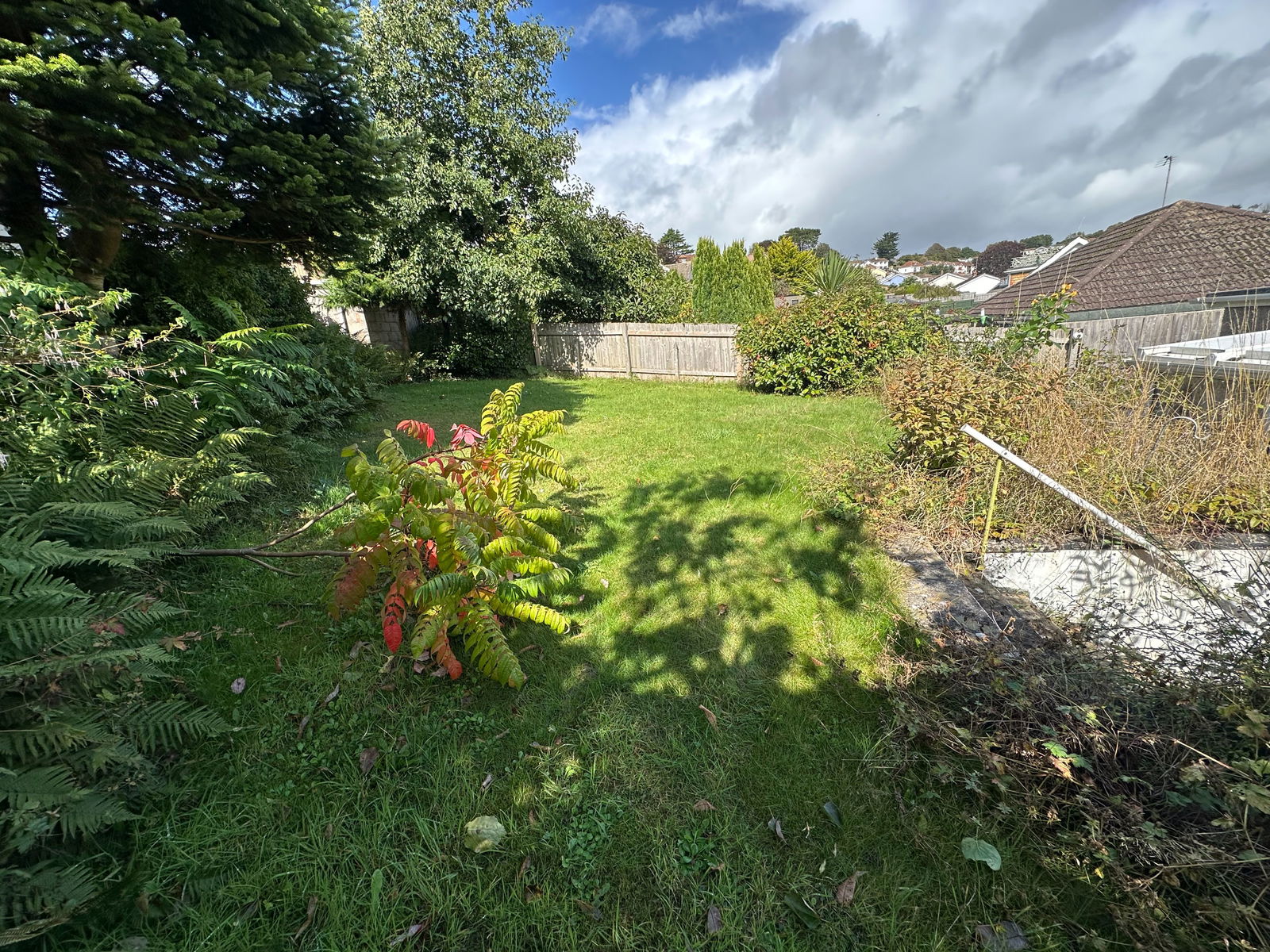 BACK GARDEN Lawned with shrubs. Shed.