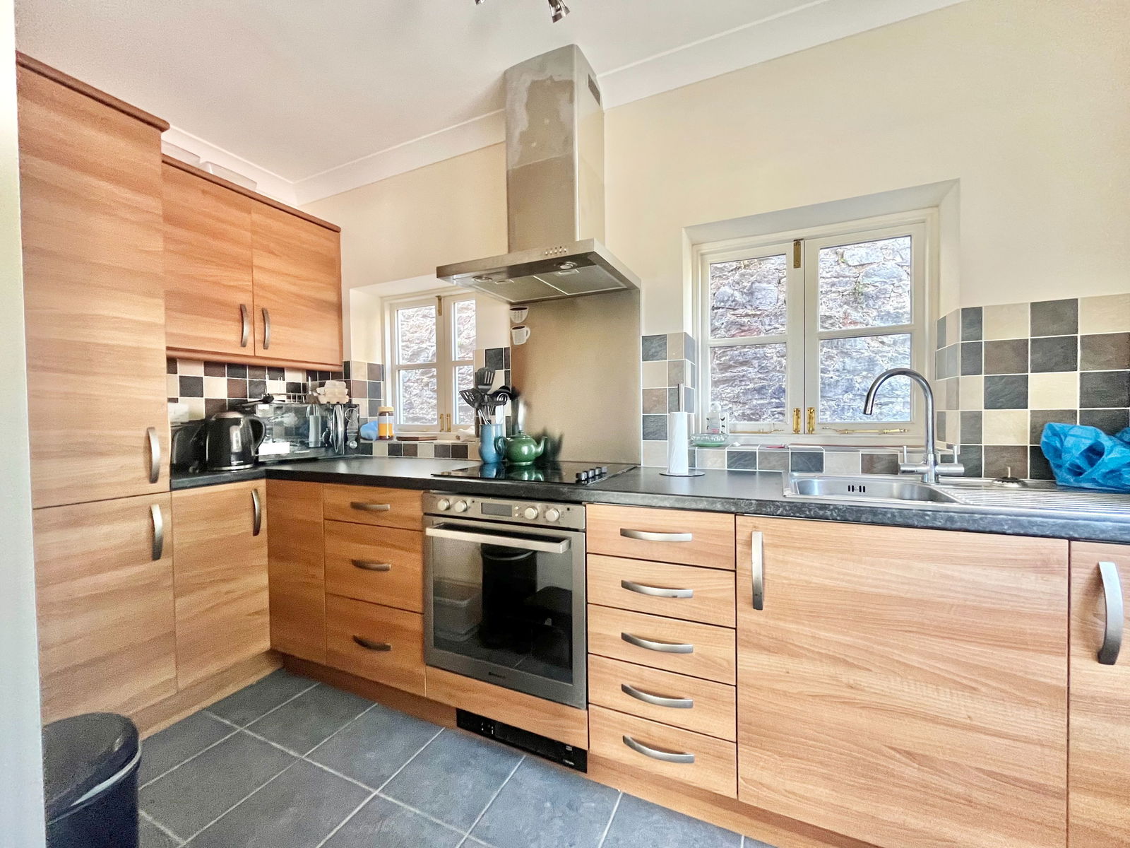 KITCHEN - 3.65m x 1.87m (11'11" x 6'1") A fitted kitchen comprising a range of overhead, base and drawer units with roll edged work surfaces above. A 1 bowl stainless steel sink and drainer unit, an electric single oven with grill integrated and a four ring induction hob with extractor hood above. An integral fridge freezer, complimentary tile backsplash, double glazed windows and a door leading out to the rear courtyard.