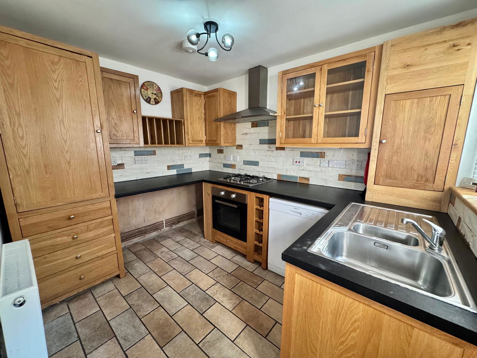 KITCHEN 9' 10" x 7' 6" (3.0m x 2.3m) Fitted with a range of solid oak wall and base units with work surface over. Single drainer stainless steel sink unit. Plumbing for washing machine. Inset stainless steel gas hob with cooker hood over. Space for fridge freezer. Under cabinet lighting. Glow Worm gas boiler for central heating and hot water installed in March 2022. Double glazed window. Stable style door to courtyard. Stairs leading to:-
