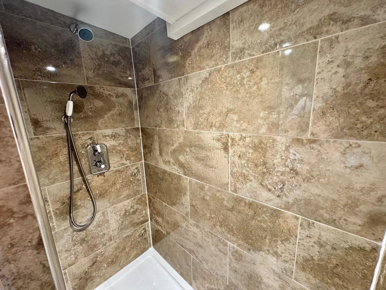 SHOWER ROOM White suite comprising walk in shower. Vanity unit with inset wash hand basin with tiled splash back. Strip light and shaver point. Linen cupboard.