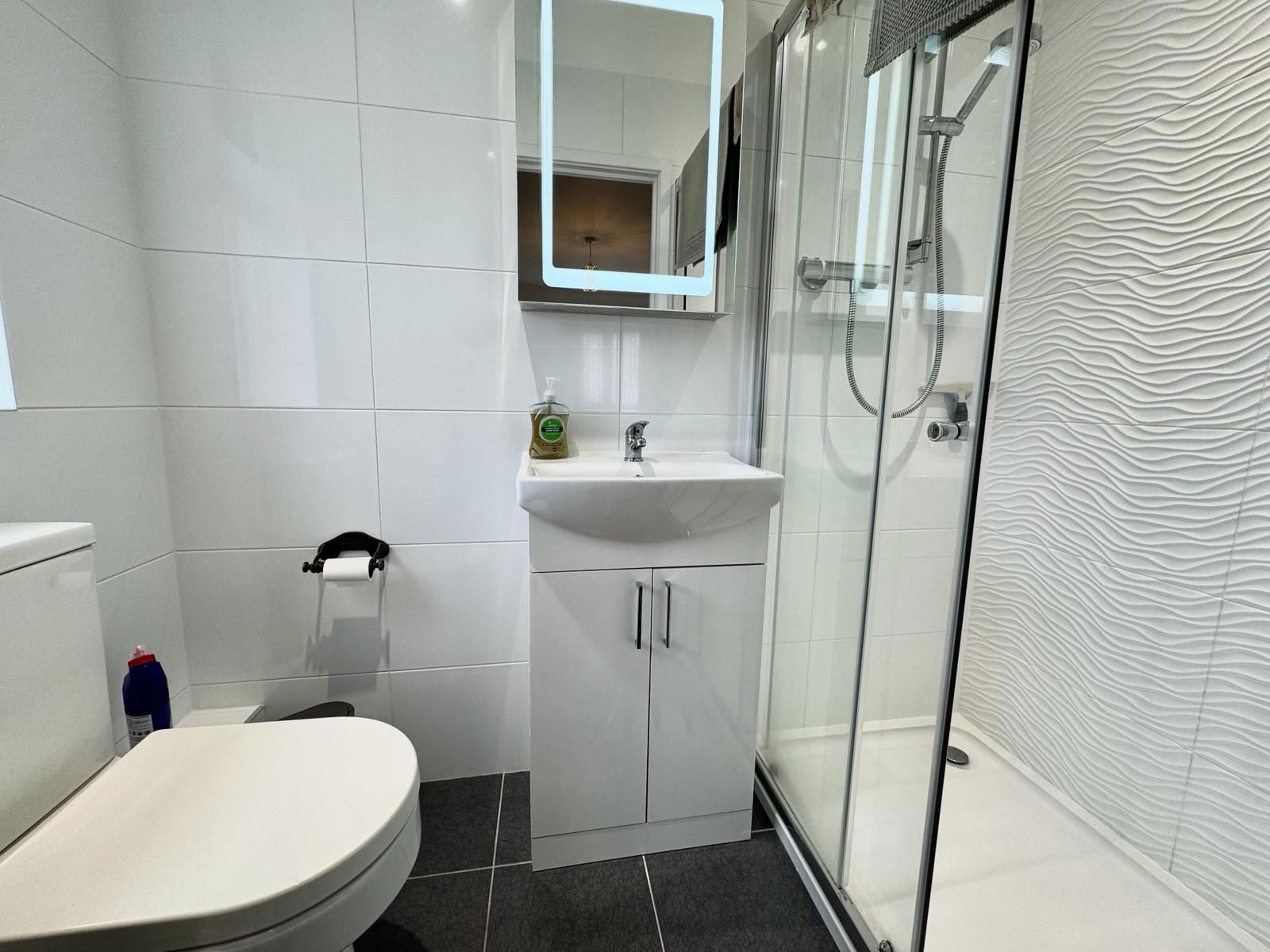 MASTER EN-SUITE A contemporary en-suite that boasts a low level flush WC, a wall mounted wash hand basin with fitted storage below and a walk in double shower unit. Complimentary tiled walls and flooring, extractor fan, uPVC obscure double glazed window and a chrome heated towel rail.