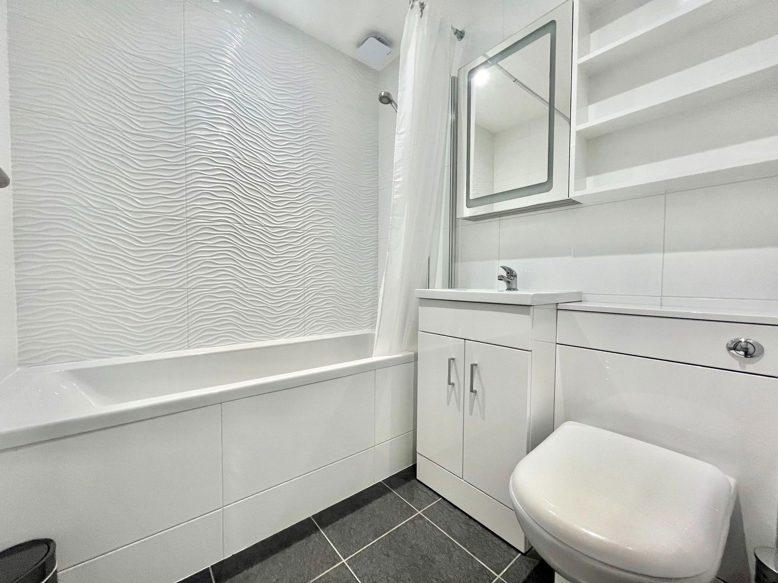 BATHROOM A luxurious family bathroom that comprises of a low level flush WC, a vanity wash hand basin with fitted storage below and a panelled bath unit with shower attachments above. Modern tiling to the walls and flooring, extractor fan and a chrome heated towel rail.
