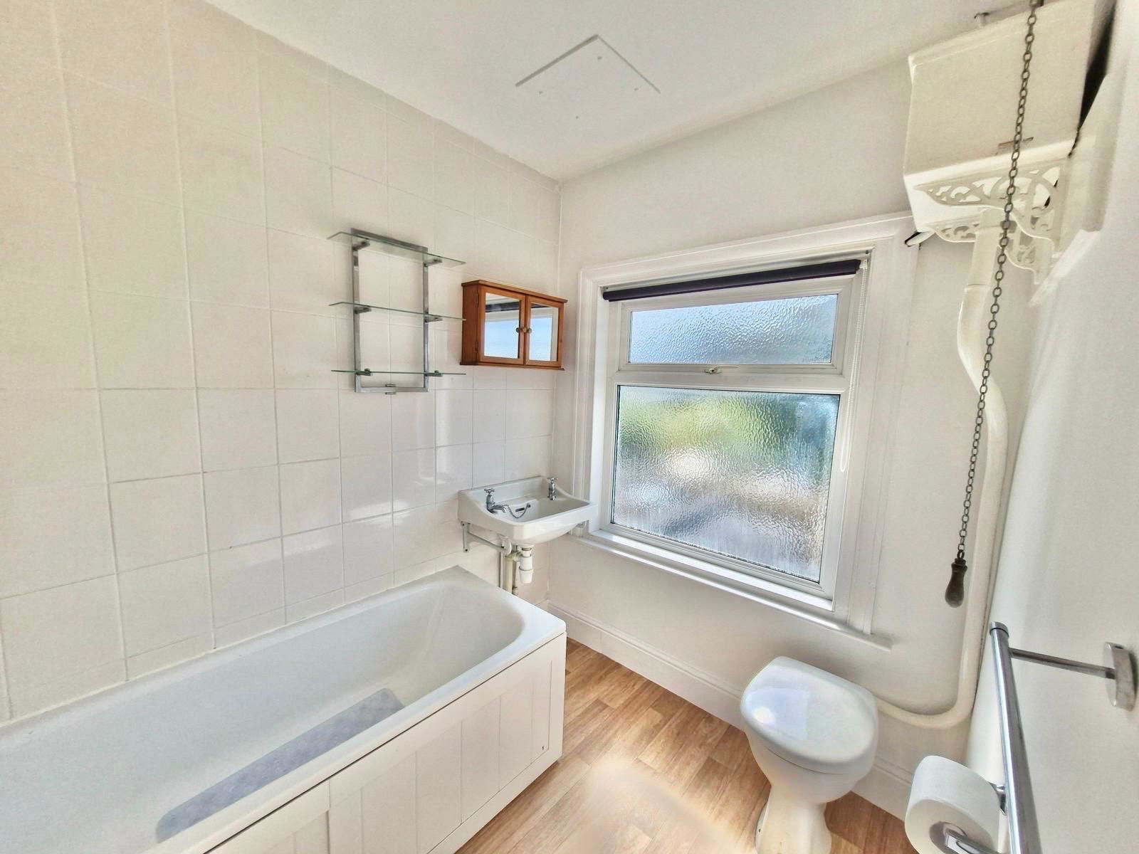 Fitted with a three piece white suite comprising a wall mounted hand wash basin, a characterful and traditional pull cord WC with separate system and a panel fronted bath with mains shower above. Frosted double glazed window to the rear aspect. Radiator. Wood effect vinyl hard flooring.